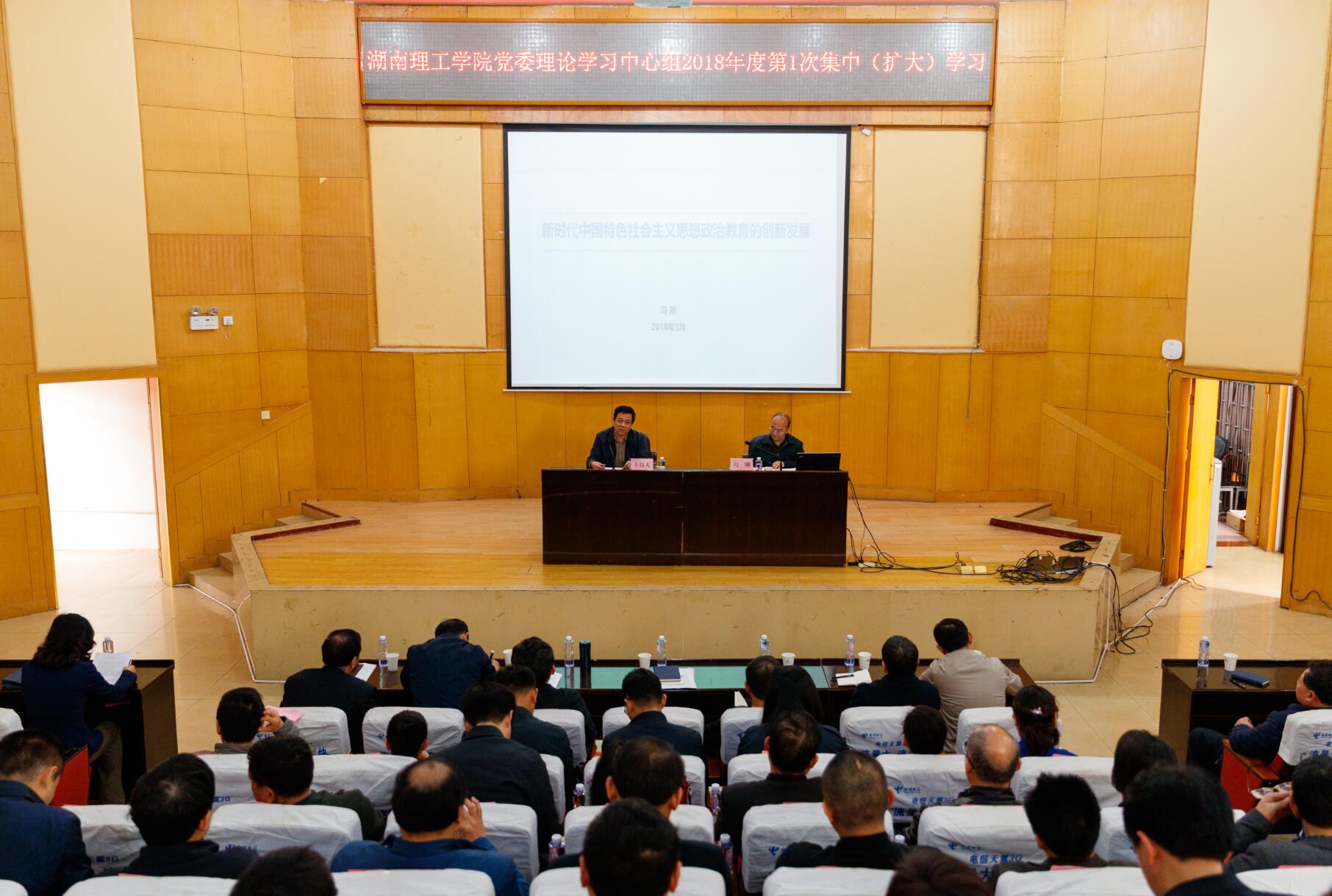 3月27日上午,学校党委理论学习中心组举行2018年度第一次集中(扩大)学习,特邀北京师范大学思想政治工作研究院院长、博士生导师冯刚来校作《新时代中国特色社会主义思想政治教育的创新发展》专题辅导报告,报告会在综合学术楼报告厅举行,党委书记李明主持。全体校领导、全校副处以上干部参加。