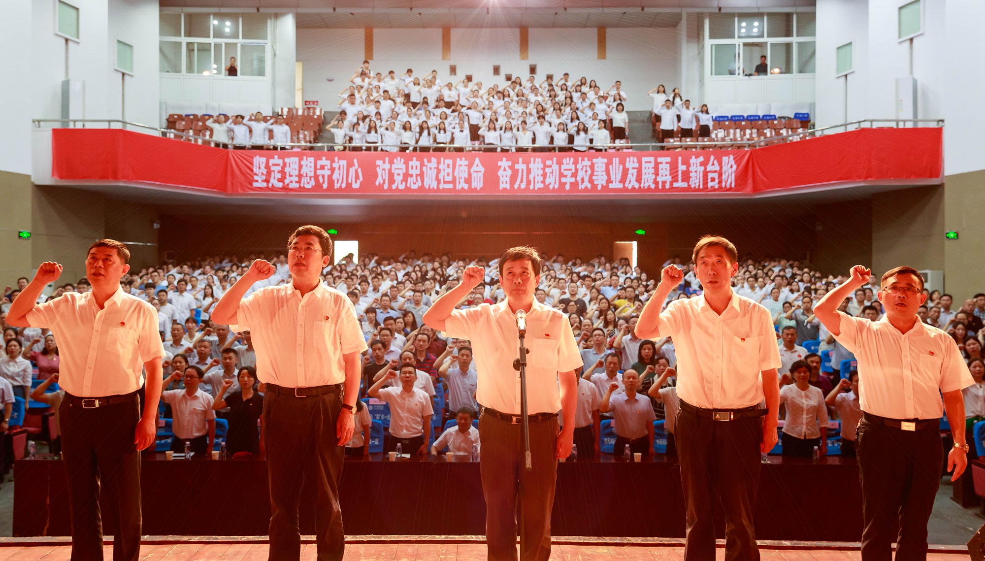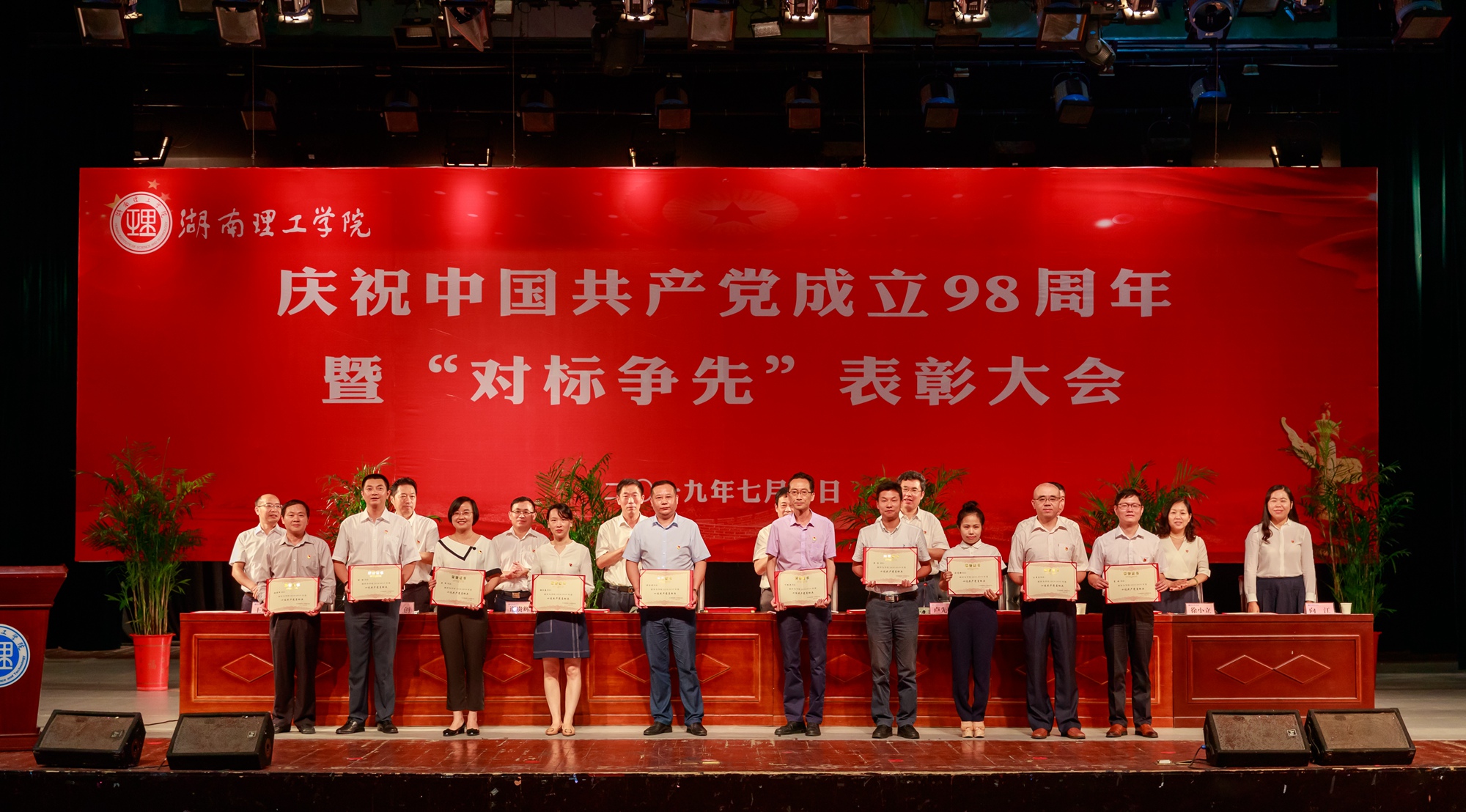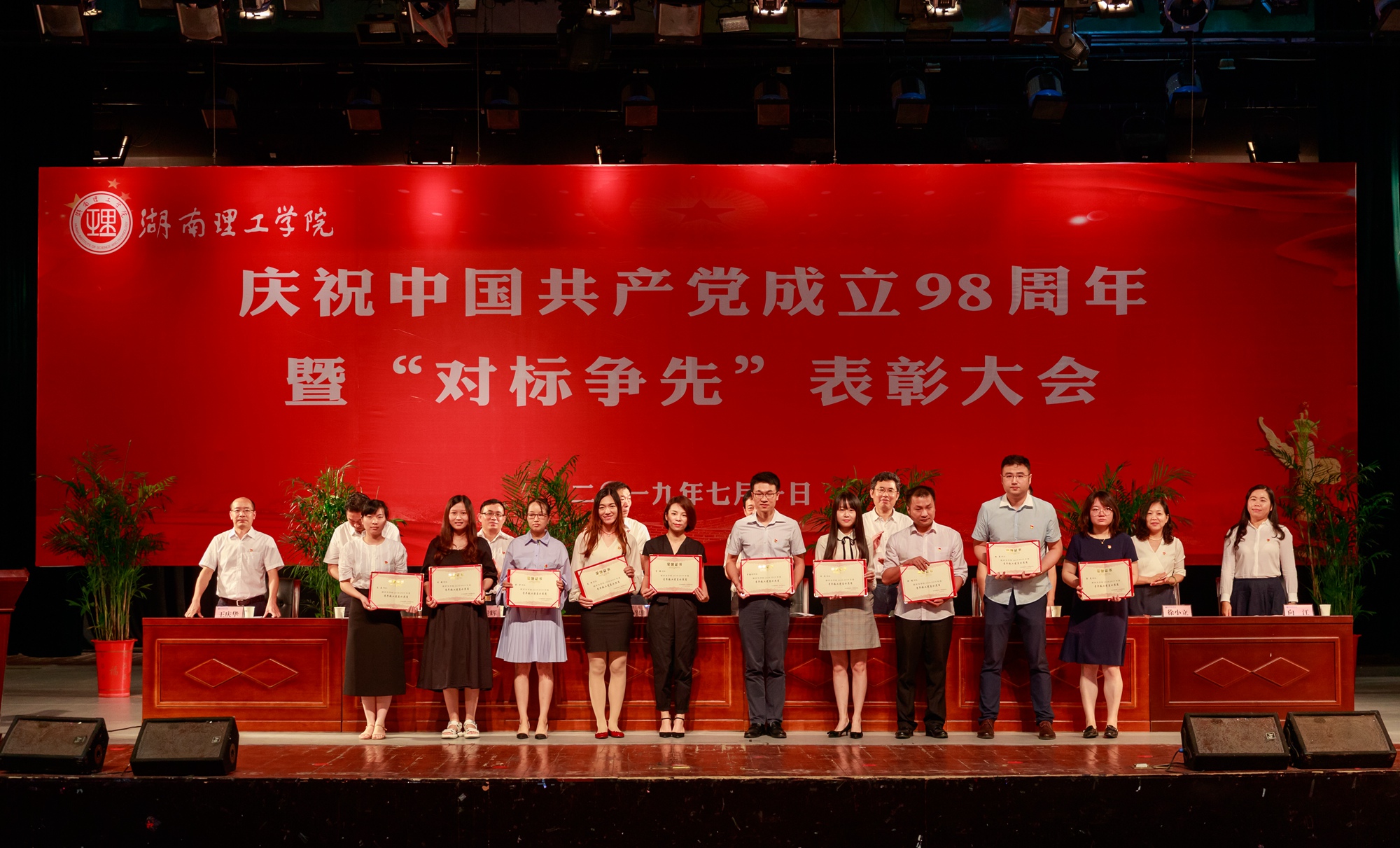 7月1日,学校召开庆祝中国共产党成立98周年暨“对标争先”表彰大会,回顾党的光辉历程,讴歌党的丰功伟绩,表彰全校党建工作标杆院系、样板支部、十佳共产党员标兵、党务工作示范岗、青年教工党员示范岗和先进分党校。党委书记李明出席并向全校各级党组织和全体共产党员致以节日的问候,向刚刚宣誓加入党组织的同志表示热烈的欢迎,向受表彰的组织和个人表示衷心的祝贺,向为学校发展付出辛勤汗水的党员同志和全校师生员工表示诚挚的谢意,要求全体党员听党话、跟党走,不忘初心、牢记使命,接续奋斗、担当作为,为实现中华民族伟大复兴的中国梦和促进学校高质量发展多做贡献、再立新功。党委副书记、校长卢先明主持会议。