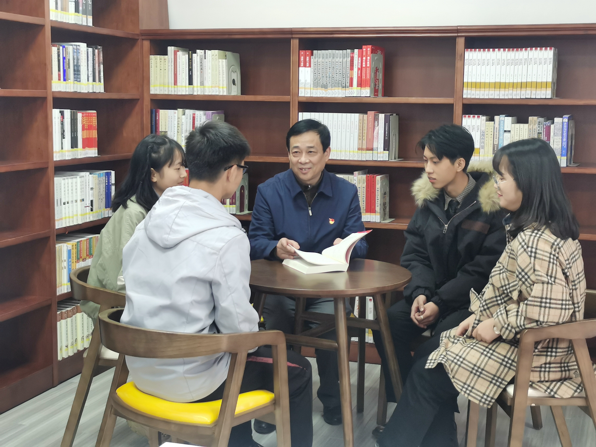 党委书记李明在红色书屋和学生就读经典、学理论展开交流