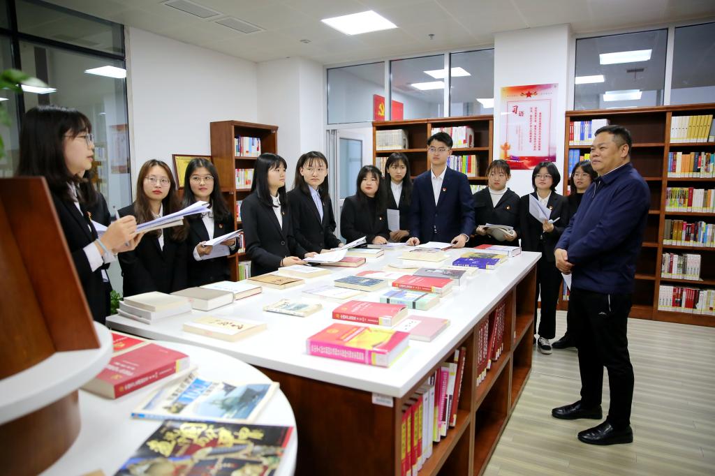 宣讲报告结束后,汤建军来到图书馆红色书屋与同学们交流党史学习