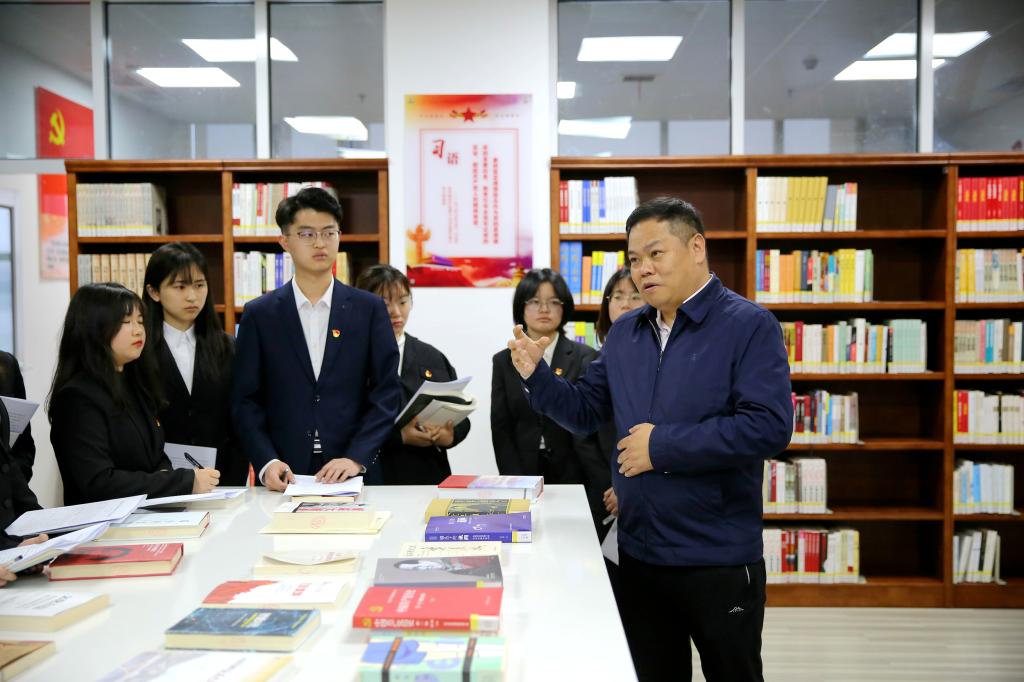 宣讲报告结束后,汤建军来到图书馆红色书屋。政法学院学生党支部正在此开展“党史学习教育”主题党日活动。汤建军来到同学们身边,仔细聆听同学们发言,与同学们亲切交谈。在交谈过程中,政法学院研究生、思政专业本科生分别就党史学习的问题、难题进行了询问,汤建军紧密结合大学生实际情况,联系生活实际,提供思维情景,以通俗易懂的语言和深入浅出的案例一一进行了解答。他希望同学们从党史中汲取智慧与力量,将党史学习同解决实际问题相结合,读好学好党史,用党的奋斗历程和伟大成就鼓舞斗志、明确方向。