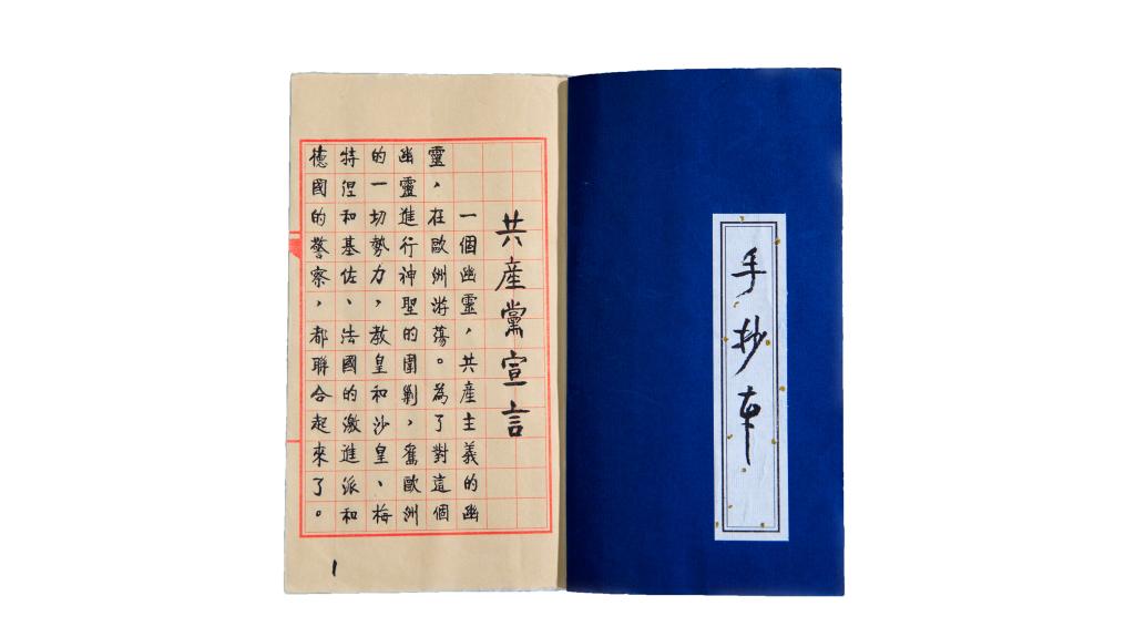 该手抄本厚达204页,一页页宣纸用白线装订成书,灰蓝色的扉页上,用金色楷体手写着“共产党宣言”“马克思 恩格斯”。据朱仁夫教授介绍,手抄本内文以《纪念马克思诞辰一百周年》纪念版的《共产党宣言》为蓝本,合计20000多字,耗时2个多月,期间两易其稿,才完成这份特殊的礼物。